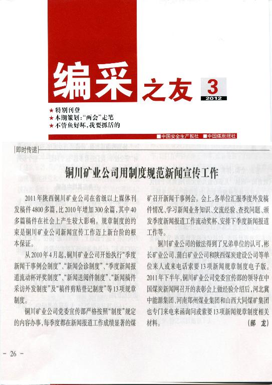 2011年陜西銅川礦業(yè)公司在省級(jí)以上媒體刊發(fā)稿件4800多篇,比2010年增加300余篇,其中40余篇稿件在社會(huì)上產(chǎn)生較大影響。規(guī)章制度的約束是銅川礦業(yè)公司新聞宣傳工作邁上新臺(tái)階的根本保證。