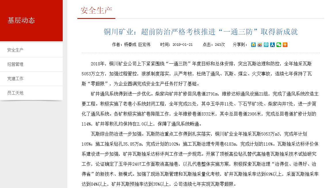 2018年,銅川礦業(yè)公司上下緊緊圍繞“一通三防”年度目標和總體安排,突出瓦斯治理和防控,全年抽采瓦斯5053萬立方,加強過程管控,狠抓制度落實,從嚴考核,杜絕了通風、瓦斯、煤塵、火災事故,連續(xù)七年保持了瓦斯“零超限”,為企業(yè)圓滿完成安全生產任務打好了基礎。