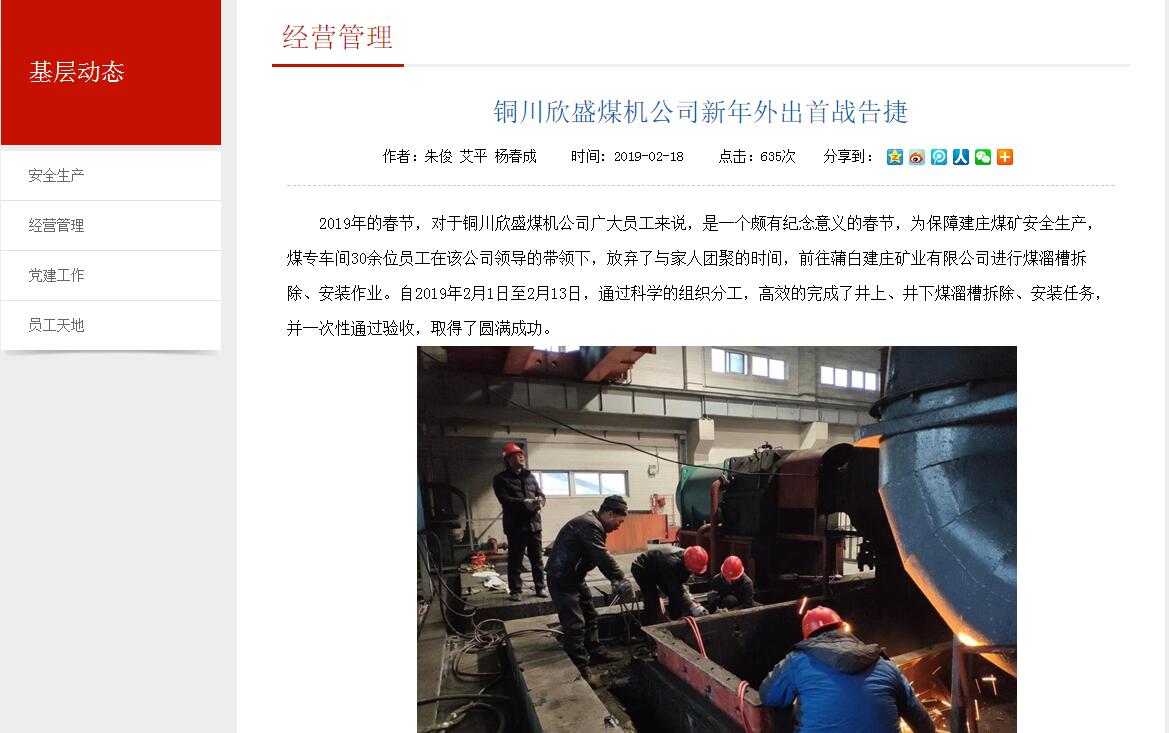 2019年的春節(jié),對(duì)于銅川欣盛煤機(jī)公司廣大員工來(lái)說(shuō),是一個(gè)頗有紀(jì)念意義的春節(jié),為保障建莊煤礦安全生產(chǎn),煤專車間30余位員工在該公司領(lǐng)導(dǎo)的帶領(lǐng)下,放棄了與家人團(tuán)聚的時(shí)間,前往蒲白建莊礦業(yè)有限公司進(jìn)行煤溜槽拆除、安裝作業(yè)。自2019年2月1日至2月13日,通過(guò)科學(xué)的組織分工,高效的完成了井上、井下煤溜槽拆除、安裝任務(wù),并一次性通過(guò)驗(yàn)收,取得了圓滿成功。