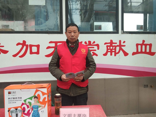 一次偶然的機(jī)會(huì),他走進(jìn)了獻(xiàn)血屋,從此他堅(jiān)持無(wú)償獻(xiàn)血9年,累計(jì)獻(xiàn)血15000毫升。超過(guò)獻(xiàn)血規(guī)定的年齡,他又轉(zhuǎn)而加入銅川市無(wú)償獻(xiàn)血志愿者隊(duì)伍,繼續(xù)奉獻(xiàn)余熱。陳萬(wàn)秀今年62歲,之前是銅川礦務(wù)局原李家塔煤礦的一名礦工,中等個(gè)頭、身材消瘦,一雙眼睛炯炯有神。