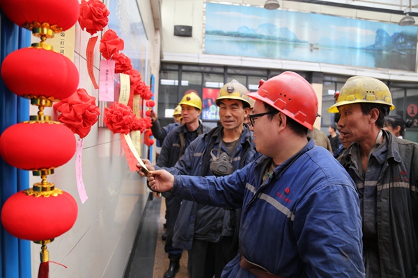 “老袁,快來看這個,幫幫我,答對了獎品算你一半,正好也跟你學(xué)習(xí)學(xué)習(xí)。”“讓我想想啊,嗯,嗯……不按曲譜彈琴,應(yīng)該是違章操作吧?”綜掘二隊楊先方雙手拉著工友袁復(fù)軍的胳膊,兩人如同小孩子一般,開工前也樂呵呵了起來,大紅的燈籠懸掛人群的兩側(cè),歡聲笑語讓錚錚鐵骨露出柔情的一面。