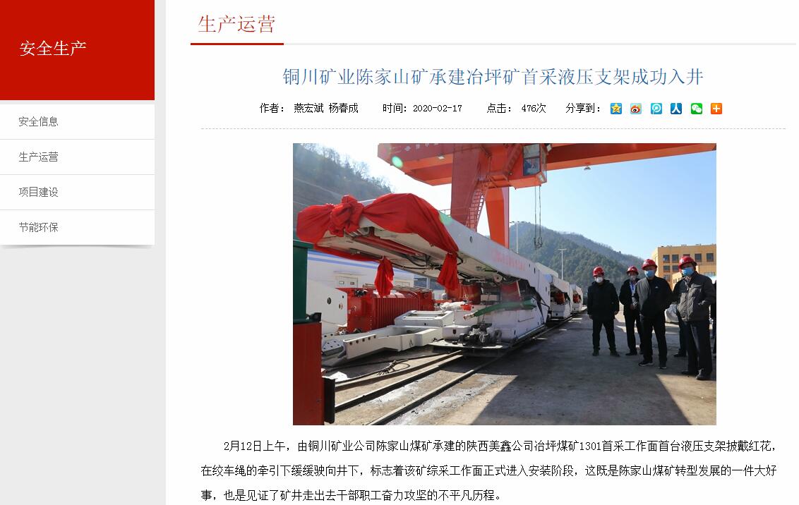 銅川礦業(yè)陳家山礦承建冶坪礦首采液壓支架成功入井