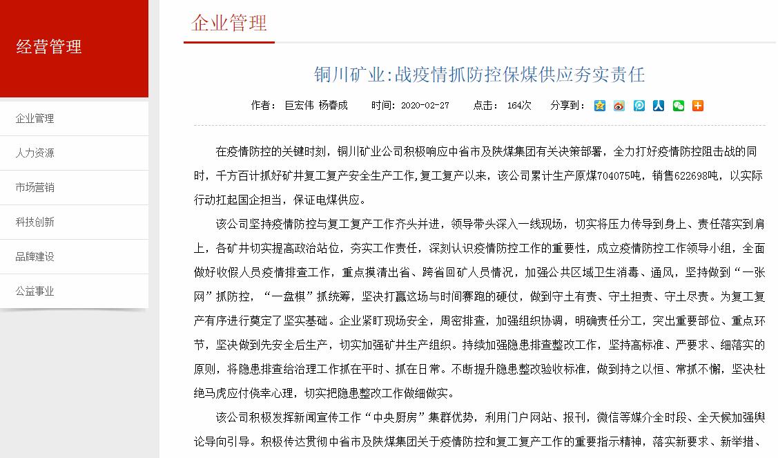 在疫情防控的關(guān)鍵時刻,銅川礦業(yè)公司積極響應中省市及陜煤集團有關(guān)決策部署,全力打好疫情防控阻擊戰(zhàn)的同時,千方百計抓好礦井復工復產(chǎn)安全生產(chǎn)工作,復工復產(chǎn)以來,該公司累計生產(chǎn)原煤704075噸,銷售622698噸,以實際行動扛起國企擔當,保證電煤供應。