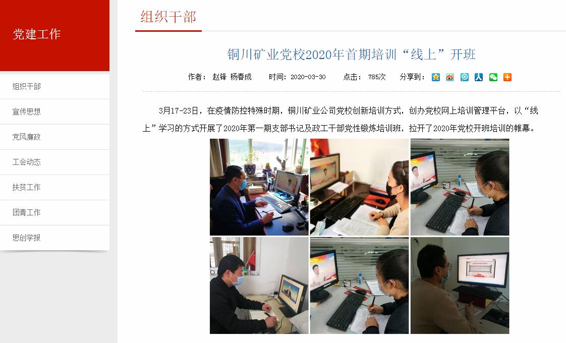 3月17-23日,在疫情防控特殊時期,銅川礦業(yè)公司黨校創(chuàng)新培訓(xùn)方式,創(chuàng)辦黨校網(wǎng)上培訓(xùn)管理平臺,以“線上”學(xué)習(xí)的方式開展了2020年第一期支部書記及政工干部黨性鍛煉培訓(xùn)班,拉開了2020年黨校開班培訓(xùn)的帷幕。