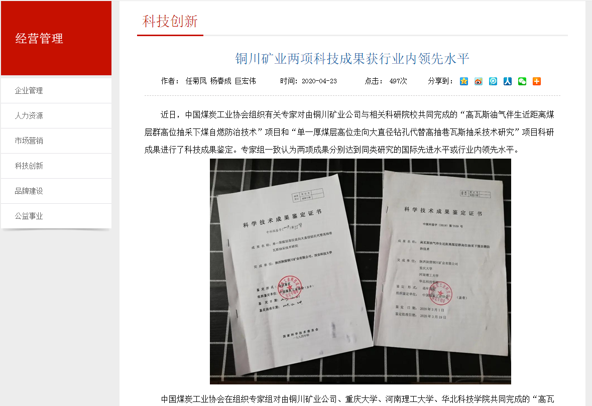 中國煤炭工業(yè)協(xié)會在組織專家組對由銅川礦業(yè)公司、重慶大學(xué)、河南理工大學(xué)、華北科技學(xué)院共同完成的“高瓦斯油氣伴生近距離煤層群高位抽采下煤自燃防治技術(shù)”項(xiàng)目進(jìn)行科技成果鑒定時(shí),一致認(rèn)為該項(xiàng)目成果對高瓦斯油氣伴生近距離煤層群高位抽采技術(shù)條件下采空區(qū)自燃綜合防治技術(shù)措施、防止采空區(qū)煤自燃提供了技術(shù)支撐,對銅川礦區(qū)的煤層自燃發(fā)火防治起到了很好的效果,并先后在銅川礦區(qū)相似工作面推廣后,產(chǎn)生了顯著的經(jīng)濟(jì)效益和社會效益,達(dá)到了同類研究的國際領(lǐng)先水平。
