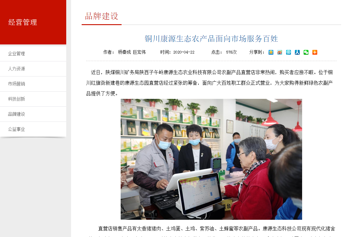 近日,陜煤銅川礦務(wù)局陜西子午嶺康源生態(tài)農(nóng)業(yè)科技有限公司農(nóng)副產(chǎn)品直營店非常熱鬧,購買者應(yīng)接不暇。位于銅川紅旗街新建巷的康源生態(tài)園直營店經(jīng)過緊張的籌備,面向廣大百姓職工群眾正式營業(yè),為大家購得新鮮綠色農(nóng)副產(chǎn)品提供了方便。
