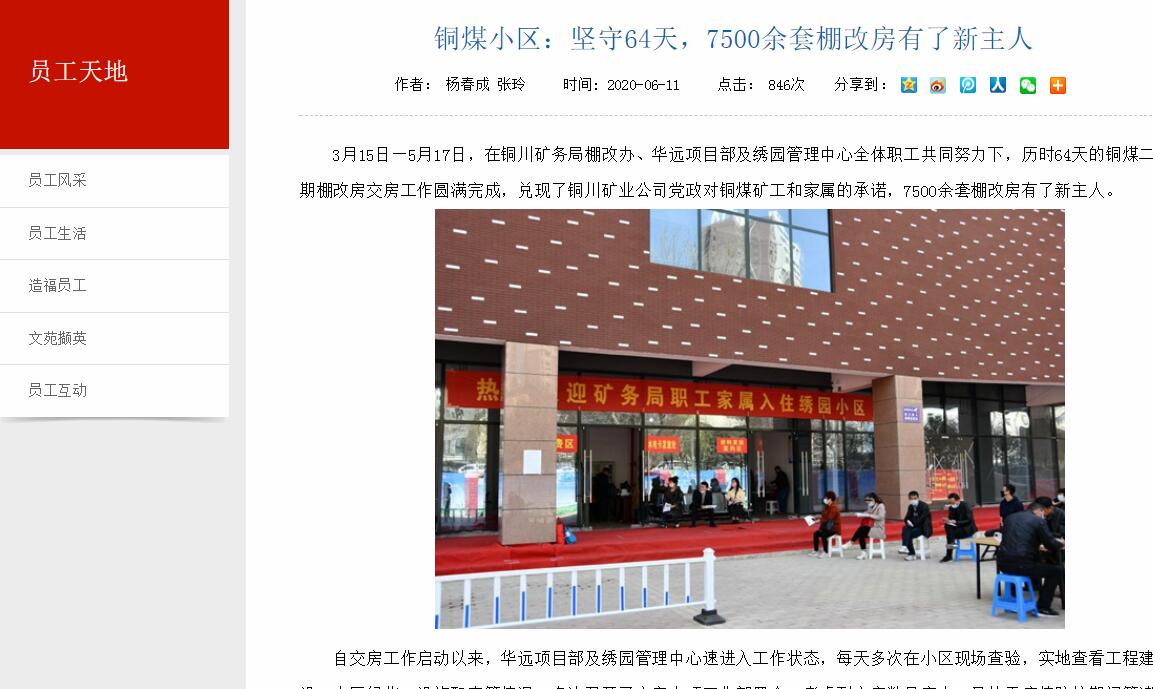 3月15日—5月17日,在銅川礦務(wù)局棚改辦、華遠(yuǎn)項(xiàng)目部及繡園管理中心全體職工共同努力下,歷時(shí)64天的銅煤二期棚改房交房工作圓滿完成,兌現(xiàn)了銅川礦業(yè)公司黨政對銅煤礦工和家屬的承諾,7500余套棚改房有了新主人。