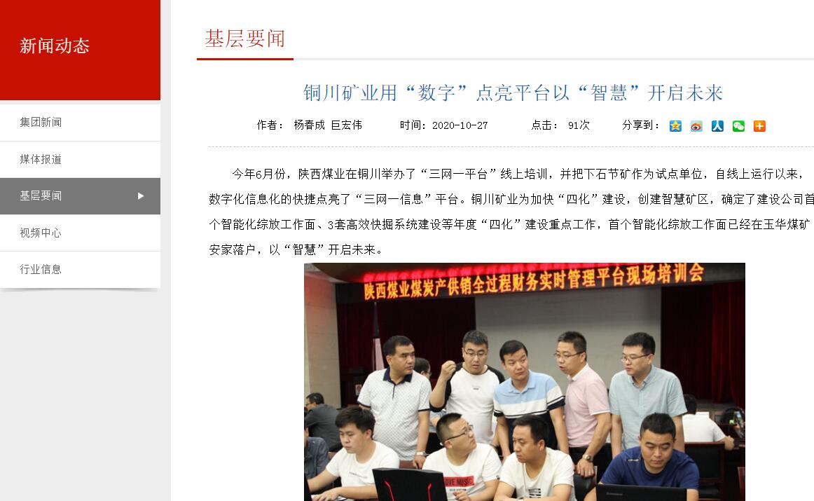 今年6月份,陜西煤業(yè)在銅川舉辦了“三網一平臺”線上培訓,并把下石節(jié)礦作為試點單位,自線上運行以來,數(shù)字化信息化的快捷點亮了“三網一信息”平臺。銅川礦業(yè)為加快“四化”建設,創(chuàng)建智慧礦區(qū),確定了建設公司首個智能化綜放工作面、3套高效快掘系統(tǒng)建設等年度“四化”建設重點工作,首個智能化綜放工作面已經在玉華煤礦安家落戶,以“智慧”開啟未來。
