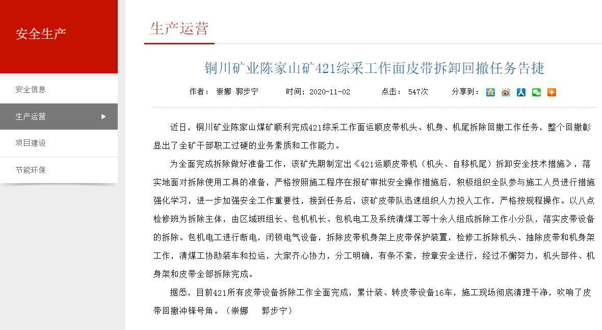 銅川礦業(yè)陳家山礦421綜采工作面皮帶拆卸回撤任務(wù)告捷