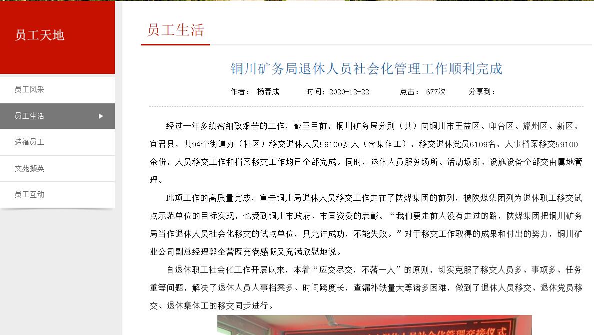 2020年7月15日,在銅川市國資委組織的銅川礦務(wù)局等5戶國有企業(yè)退休人員移交協(xié)議集中簽字儀式上,銅川礦務(wù)局與銅川市王益區(qū)、印臺區(qū)、耀州區(qū)、新區(qū)管委會、宜君縣分別簽訂了《銅川市國有企業(yè)退休人員社會化管理服務(wù)工作移交協(xié)議書》,以各項(xiàng)工作的保質(zhì)保量完成為戰(zhàn)略目標(biāo),保障了礦務(wù)局移交工作的扎實(shí)細(xì)致推進(jìn)和完成。