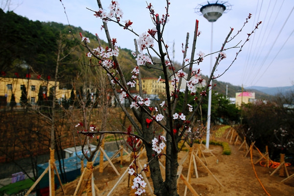 雨后清新,藍(lán)天白云。大道兩側(cè)紅葉李花綻放如滿天繁星,一路花開一路飄香。副井塔下,如云似霞的櫻花滿樹爛漫,搖曳枝頭笑春風(fēng)。山外已落,山中正艷的桃花朵朵,妖嬈爭(zhēng)春。
