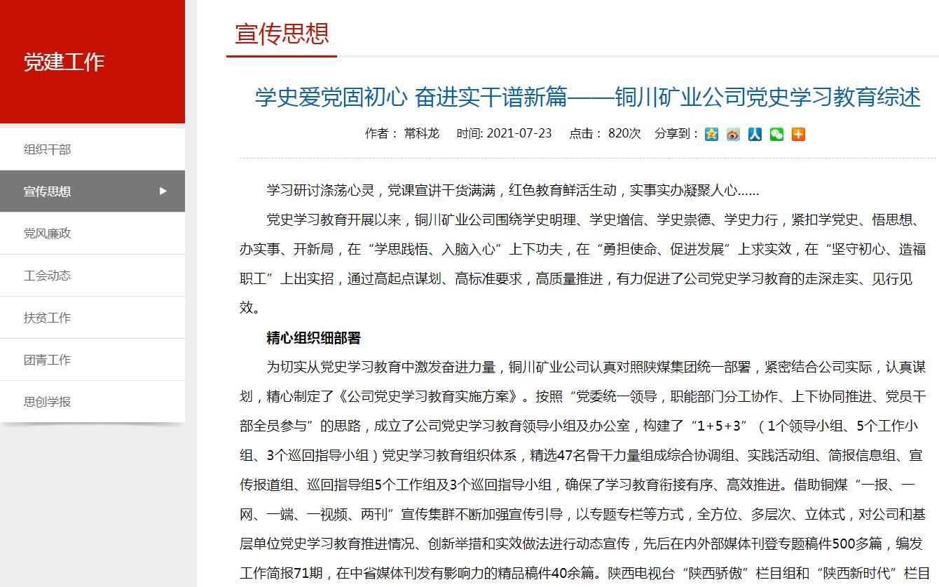 為切實從黨史學習教育中激發(fā)奮進力量,銅川礦業(yè)公司認真對照陜煤集團統(tǒng)一部署,緊密結(jié)合公司實際,認真謀劃,精心制定了《公司黨史學習教育實施方案》。按照“黨委統(tǒng)一領(lǐng)導,職能部門分工協(xié)作、上下協(xié)同推進、黨員干部全員參與”的思路,成立了公司黨史學習教育領(lǐng)導小組及辦公室,構(gòu)建了“1+5+3”(1個領(lǐng)導小組、5個工作小組、3個巡回指導小組)黨史學習教育組織體系,精選47名骨干力量組成綜合協(xié)調(diào)組、實踐活動組、簡報信息組、宣傳報道組、巡回指導組5個工作組及3個巡回指導小組,確保了學習教育銜接有序、高效推進。借助銅煤“一報、一網(wǎng)、一端、一視頻、兩刊”宣傳集群不斷加強宣傳引導,以專題專欄等方式,全方位、多層次、立體式,對公司和基層單位黨史學習教育推進情況、創(chuàng)新舉措和實效做法進行動態(tài)宣傳,先后在內(nèi)外部媒體刊登專題稿件500多篇,編發(fā)工作簡報71期,在中省媒體刊發(fā)有影響力的精品稿件40余篇。陜西電視臺“陜西驕傲”欄目組和“陜西新時代”欄目組,先后赴公司開展了建黨百年大型采風活動,各單位學黨史熱度持續(xù)升溫,營造了濃厚的黨史學習教育氛圍。