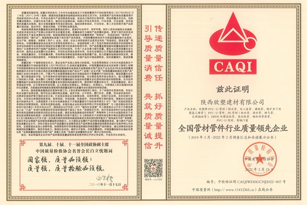 日前,從中國(guó)質(zhì)量檢驗(yàn)協(xié)會(huì)傳來(lái)好消息,銅川礦務(wù)局欣塑公司喜獲“全國(guó)管材管件行業(yè)質(zhì)量領(lǐng)先企業(yè)”榮譽(yù)。