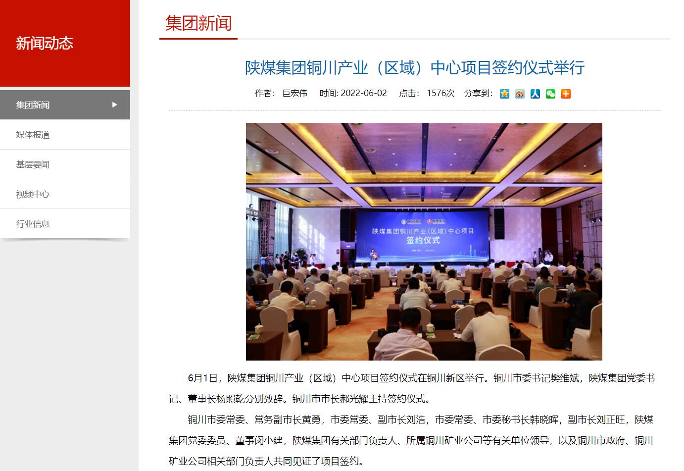6月1日,陜煤集團(tuán)銅川產(chǎn)業(yè)(區(qū)域)中心項(xiàng)目簽約儀式在銅川新區(qū)舉行。銅川市委書記樊維斌,陜煤集團(tuán)黨委書記、董事長(zhǎng)楊照乾分別致辭。銅川市市長(zhǎng)郝光耀主持簽約儀式。