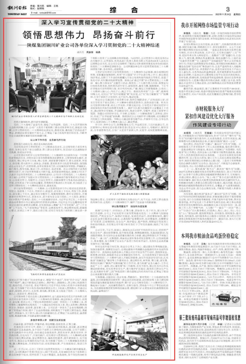 玉華礦切實(shí)將學(xué)習(xí)宣傳貫徹黨的二十大精神作為必修課,結(jié)合疫情防控形勢(shì),采取播放視頻資料、利用“學(xué)習(xí)強(qiáng)國(guó)”學(xué)習(xí)平臺(tái)進(jìn)行線上學(xué)習(xí)、舉辦理論知識(shí)考試、在職工下井途經(jīng)的候罐大廳設(shè)立電視和報(bào)刊閱讀點(diǎn)等形式,營(yíng)造了處處可學(xué)、時(shí)時(shí)勤學(xué)的濃厚氛圍。陳家山礦通過(guò)開(kāi)展“學(xué)習(xí)貫徹黨的二十大精神 凝心聚力保安全”主題黨日活動(dòng),將黨的二十大報(bào)告要點(diǎn)內(nèi)容、智慧金句印發(fā)給各黨支部,組織黨員進(jìn)行學(xué)習(xí)、深悟原理、激發(fā)力量、提振精神。下石節(jié)礦持續(xù)加大宣傳貫徹力度,充分利用電視、廣播、微信工作群等載體,讓黨的二十大精神入腦入心、內(nèi)化于心、踐之于行。柴家溝井采取“三會(huì)一課”、教育培訓(xùn)等方式,切實(shí)以“學(xué)”的行動(dòng)增強(qiáng)“做”的自覺(jué)、以“實(shí)”的力量激發(fā)“干”的精神,引導(dǎo)干部職工立足崗位、實(shí)干擔(dān)當(dāng)、推動(dòng)發(fā)展。