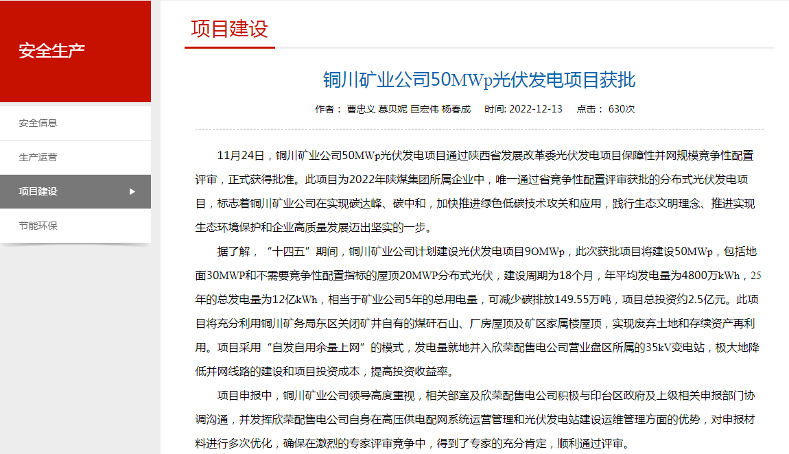 11月24日,銅川礦業(yè)公司50MWp光伏發(fā)電項(xiàng)目通過(guò)陜西省發(fā)展改革委光伏發(fā)電項(xiàng)目保障性并網(wǎng)規(guī)模競(jìng)爭(zhēng)性配置評(píng)審,正式獲得批準(zhǔn)。此項(xiàng)目為2022年陜煤集團(tuán)所屬企業(yè)中,唯一通過(guò)省競(jìng)爭(zhēng)性配置評(píng)審獲批的分布式光伏發(fā)電項(xiàng)目,標(biāo)志著銅川礦業(yè)公司在實(shí)現(xiàn)碳達(dá)峰、碳中和,加快推進(jìn)綠色低碳技術(shù)攻關(guān)和應(yīng)用,踐行生態(tài)文明理念、推進(jìn)實(shí)現(xiàn)生態(tài)環(huán)境保護(hù)和企業(yè)高質(zhì)量發(fā)展邁出堅(jiān)實(shí)的一步。