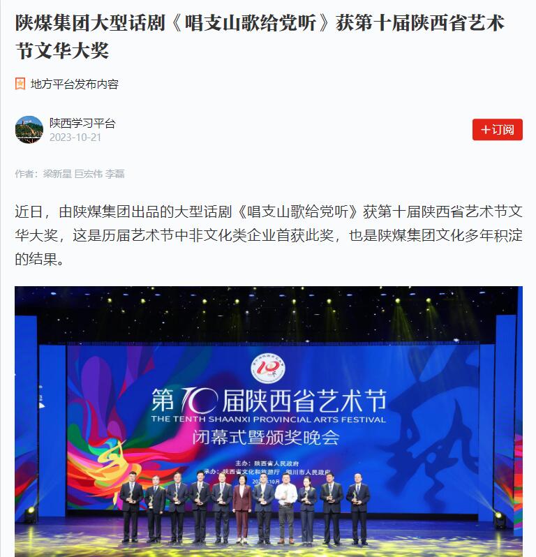 近日,由陜煤集團(tuán)出品的大型話劇《唱支山歌給黨聽》獲第十屆陜西省藝術(shù)節(jié)文華大獎(jiǎng),這是歷屆藝術(shù)節(jié)中非文化類企業(yè)首獲此獎(jiǎng),也是陜煤集團(tuán)文化多年積淀的結(jié)果。