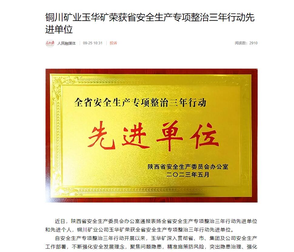 銅川礦業(yè)玉華礦榮獲省安全生產(chǎn)專項整治三年行動先進單位