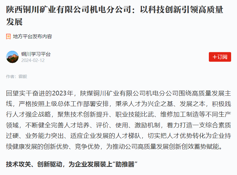 回望實干奮進的2023年,陜煤銅川礦業(yè)有限公司機電分公司圍繞高質(zhì)量發(fā)展主線,嚴(yán)格按照上級總體工作部署安排,秉承人才為興企之基、發(fā)展之本,積極踐行人才強企戰(zhàn)略,聚焦技術(shù)創(chuàng)新提升、職業(yè)技能比武、維修加工制造等不同生產(chǎn)領(lǐng)域,不斷健全完善人才培養(yǎng)、評價、使用、激勵機制,著力打造一支綜合素質(zhì)過硬、業(yè)務(wù)能力突出、適應(yīng)企業(yè)發(fā)展的人才梯隊,切實把人才優(yōu)勢轉(zhuǎn)化為企業(yè)持續(xù)健康發(fā)展的創(chuàng)新優(yōu)勢、競爭優(yōu)勢,為推動公司高質(zhì)量發(fā)展創(chuàng)新創(chuàng)效蓄勢賦能。