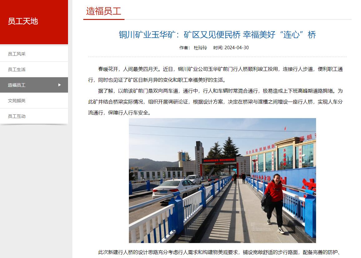 春暖花開(kāi),人間最美四月天。近日,銅川礦業(yè)公司玉華礦前門行人橋順利竣工投用,連接行人步道,便利職工通行,同時(shí)也見(jiàn)證了礦區(qū)日新月異的變化和職工幸福美好的生活。