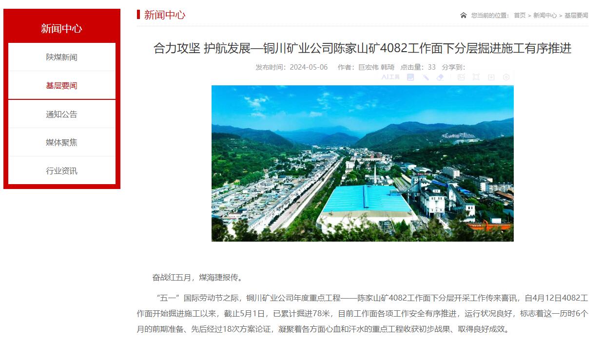 銅川礦業(yè)公司陳家山礦4082工作面下分層安全開采,是銅川礦業(yè)公司黨政帶領(lǐng)干部職工知重負(fù)重、爬坡過坎的接續(xù)奮斗;是銅煤職工拿出“只要思想不滑坡、辦法總比困難多”的信心與勇氣,破解老礦區(qū)生存發(fā)展難題的務(wù)實(shí)創(chuàng)新之舉,以起筆不凡、落筆精彩、執(zhí)行有力、科學(xué)有序之策,開啟了陳家山礦和銅煤高質(zhì)量發(fā)展新的一頁,以超常決心、超常舉措、超常力度,為探尋全國同類條件下煤礦下分層安全開采提供了“銅煤樣板”。(巨宏偉 韓琦)