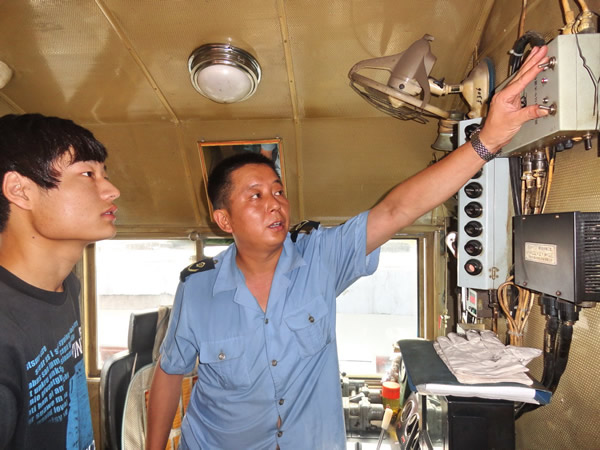 組圖為機(jī)車司機(jī)向新學(xué)員介紹機(jī)車結(jié)構(gòu)及相關(guān)設(shè)施