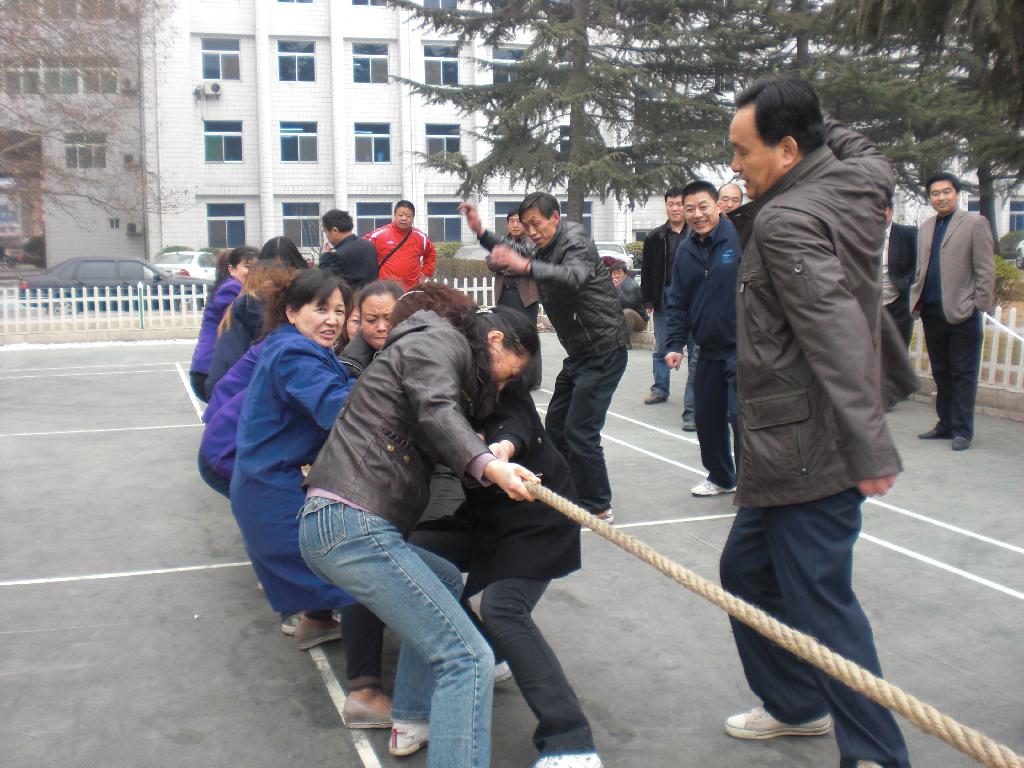 隨著哨音的吹響,激動(dòng)人心的拔河比賽開始了!各個(gè)代表隊(duì)輪番上場,雙方隊(duì)員緊緊抓牢手中的繩子,個(gè)個(gè)使出渾身力氣,咬緊牙關(guān),臉憋得通紅,雙手拔得通紅,仍然奮力拼搏,齊心協(xié)力往后拉。場場比賽牽動(dòng)著場外觀賽職工的心,紛紛在旁加油助威,熱情的啦啦隊(duì)在場外高喊著“加油!加油!”,笑聲、掌聲、加油聲此起彼伏。。。。。。