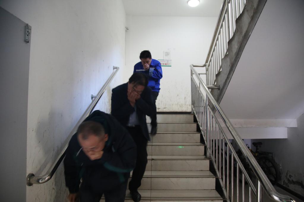 演練過(guò)程中,駐礦救護(hù)隊(duì)員們?nèi)缟癖旖?,迅速展開(kāi)滅火救援,對(duì)準(zhǔn)著火點(diǎn)噴射,精準(zhǔn)壓制火勢(shì)。各樓層職工聞聲而動(dòng),在樓層引導(dǎo)員的指揮下,低姿彎腰、手捂口鼻、沿著墻壁快步前行,有序向樓下疏散。陳家山醫(yī)院救護(hù)人員第一時(shí)間對(duì)受傷員工進(jìn)行急救,整個(gè)過(guò)程一氣呵成、緊張有序,盡顯專(zhuān)業(yè)素養(yǎng)與高效協(xié)同。