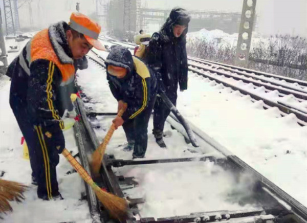 面對(duì)大范圍降雪,嚴(yán)陣以待的榆橫項(xiàng)目部立即啟動(dòng)除雪應(yīng)急預(yù)案,吹響除雪保暢通“集結(jié)號(hào)”,工務(wù)、電務(wù)專業(yè)組織干部職工及時(shí)清掃道岔、道口等重點(diǎn)處所積雪,對(duì)清掃后的道岔轉(zhuǎn)轍部位使用鏟刀進(jìn)行再次除冰清理及噴灑防凍液,確保道岔關(guān)鍵處所無(wú)積雪凍冰,同時(shí),項(xiàng)目部安全主管組織各專業(yè)負(fù)責(zé)人采取添乘機(jī)車和徒步檢查相結(jié)合的方式,動(dòng)態(tài)掌握全線冰雪情況,組織干部職工不間斷除雪,全面清理鋼軌輪緣槽、道口鋪面、平臺(tái)和道口兩側(cè)路面積雪清理工作,嚴(yán)防積雪冰柱侵入限界;機(jī)務(wù)專業(yè)對(duì)機(jī)車入庫(kù)后組織檢修人員對(duì)制動(dòng)缸進(jìn)行一次開(kāi)蓋檢查,及時(shí)清理轉(zhuǎn)向架積冰積雪,開(kāi)展走行部及制動(dòng)裝置專項(xiàng)檢查,確保機(jī)車安全運(yùn)行。