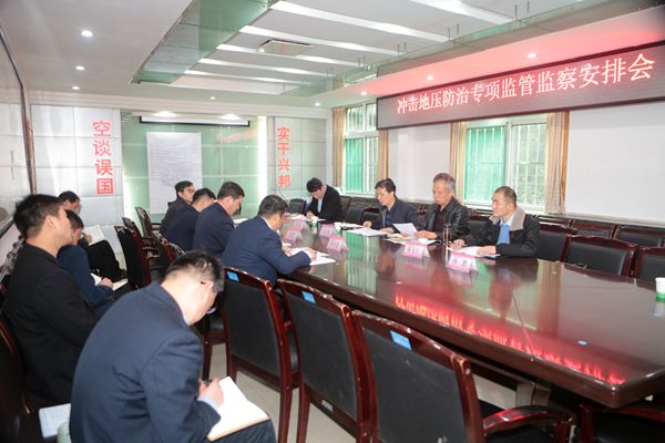高雙鎖一行到礦后,與該礦領(lǐng)導(dǎo)在機關(guān)二樓會議室召開了檢查工作安排會,監(jiān)察組人員對此次監(jiān)察的目的、意義和檢查重點進行了說明。對照礦井采掘工程平面圖,聽取了該礦礦井的基本情況,對礦井自然災(zāi)害種類、沖擊地壓設(shè)備投入、人員組織機構(gòu)、鉆孔施工臺賬、監(jiān)測日報表等方面工作進行了深入的溝通交流,提出了專業(yè)化的指導(dǎo)意見和建議。