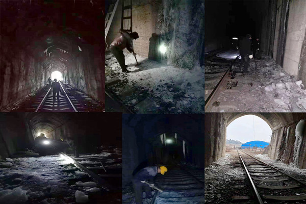 柴家溝井一號煤臺負(fù)責(zé)礦井煤炭鐵路銷售的任務(wù),而焦平窯洞段隧道是煤臺通往外界運(yùn)輸?shù)谋亟?jīng)之路,每年礦井產(chǎn)出的煤炭由一號煤臺裝車,通過鐵路運(yùn)往全國各地,冬季由于隧道地勢較低,洞內(nèi)積水容易結(jié)冰,洞頂洞壁容易產(chǎn)生冰掛,對火車安全運(yùn)輸造成了安全隱患,為保障鐵路運(yùn)輸一路暢通,有這樣一群人,他們在冬季的“必修課”就是冒著嚴(yán)寒打冰。