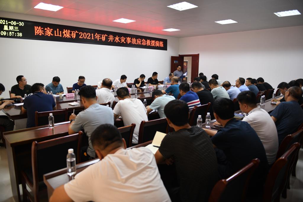 6月30日,隨著一陣急促的電話鈴聲響起,“418疏水巷發(fā)生水災(zāi)事故,涌水量較大,積水以淹沒(méi)綜掘機(jī)履帶,且水位上升迅速,已通知418疏水巷和運(yùn)順?biāo)凶鳂I(yè)人員全部撤離……”。在陳家山煤礦調(diào)度指揮中心,一場(chǎng)礦井水災(zāi)事故實(shí)戰(zhàn)應(yīng)急演練正有條不紊地進(jìn)行著。