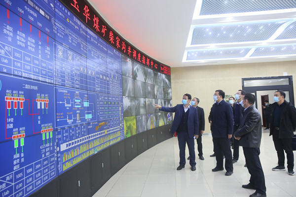 一行人到礦后,來到調(diào)度指揮中心,該礦通過全景式電子大屏屏幕為王斌詳細(xì)介紹了井下工作面安全生產(chǎn)情況、系統(tǒng)巷道修復(fù)等現(xiàn)場生產(chǎn)實(shí)際,地面職工食堂、工業(yè)廣場地坪硬化和二號職工宿舍等項(xiàng)目的實(shí)施改造有關(guān)情況。 圍繞礦井今后發(fā)展,該礦礦長介紹到,柴家溝井自2014年劃歸銅川礦業(yè)以來,礦井在科技投入方面,對于先進(jìn)設(shè)備的引進(jìn)和技術(shù)人才的培養(yǎng)下足了功夫,一方面井下42226智能化綜采工作面設(shè)備經(jīng)過調(diào)試運(yùn)行后,可實(shí)現(xiàn)作業(yè)現(xiàn)場無人操作,即降低了人力的投入,又保證了現(xiàn)場安全。另一方面成功引用井下巷道智能巡檢機(jī)器人,代替人工全時(shí)段、全區(qū)域不間斷巡檢,精準(zhǔn)記錄環(huán)境溫度、氣體含量、設(shè)備溫度、煙霧預(yù)警、異物識別,紅外檢測分析等信息上傳,為檢修工作提供了堅(jiān)實(shí)有力地保障。礦井42226運(yùn)順巷道歷時(shí)5個(gè)月能夠快速成巷,離不開掘錨一體機(jī)的功勞,它的整機(jī)噸位大,掘錨同步,切割硬度高,截齒損耗小,機(jī)器穩(wěn)定性好,操作方便,可靠性高等特點(diǎn),可保障一個(gè)圓班連續(xù)掘進(jìn),實(shí)現(xiàn)了掘、支、運(yùn)工序平行作業(yè)同步完成。與此同時(shí),TDS矸選系統(tǒng)、磅房無人值守、全封閉式煤臺、運(yùn)煤車輛篷布自動(dòng)收縮裝置等先進(jìn)設(shè)備成功引用以及下一步的井下實(shí)施5G網(wǎng)絡(luò)全覆蓋,使得礦井在科技引領(lǐng)方面始終走在了關(guān)中地區(qū)高質(zhì)量發(fā)展的最前沿。這些成績的背后離不開縣政府的鼎力支持,就疫情防控工作,他說,礦井嚴(yán)格執(zhí)行省、市、縣及礦業(yè)公司關(guān)于做好疫情防控最新通知文件精神和工作要求,堅(jiān)持對請銷假人員、外來人員核酸檢測報(bào)告、體溫檢測、行動(dòng)軌跡等相關(guān)信息的精準(zhǔn)掌握,堅(jiān)持對作業(yè)場所消毒和人員錯(cuò)峰就餐制,堅(jiān)持在礦人員全程佩戴口罩,定期測量體溫,以最大能力保證職工身體健康和生命安全,實(shí)現(xiàn)礦井安全穩(wěn)定。
