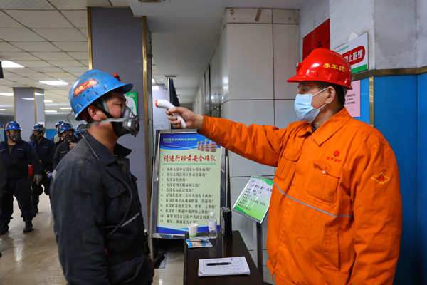 3月10日下午,玉華煤礦侯罐大廳,即將入井的干部職工在安全確認門前經過嚴格的身體狀況報備、體溫測量、安全檢身,佩戴口罩,保持安全距離,分5批次乘坐罐籠進入井下工作崗位。