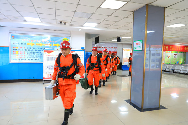 礦井隨即成立地面救援指揮部和井下現(xiàn)場指揮部,總指揮向技術(shù)專家、物資供應(yīng)、通訊、生活、醫(yī)療、保衛(wèi)等各小組下達(dá)搶險救災(zāi)命令,各應(yīng)急小組聞令而動,快速反應(yīng)、各司其職,依托智能管理系統(tǒng),科學(xué)分析研判災(zāi)情,在最短時間內(nèi)制定救援方案、組織救援隊伍,人員、物資迅速匯集,展開搶險救災(zāi)工作,并聯(lián)系社區(qū)醫(yī)院醫(yī)護(hù)人員趕赴副井口醫(yī)療站嚴(yán)陣以待。