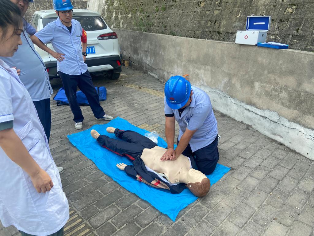 現(xiàn)場(chǎng)培訓(xùn)老師還利用模擬人進(jìn)行觸電急救演示,包括暢通氣道、清理口腔、口對(duì)口呼吸、胸部按壓、兩手手指交叉、掌根重疊、搶救者需雙臂繃直等流程。