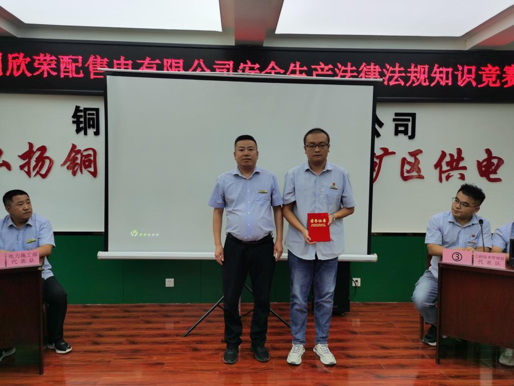 此次競賽包括必答題、搶答題和風險題三個環(huán)節(jié),緊扣安全生產(chǎn)法律法規(guī)、電力行業(yè)安全生產(chǎn)基礎知識等內容。最終,經(jīng)過激烈角逐,所屬電力調度中心代表隊取得冠軍,市場營銷部取得二等獎、電力施工部代表隊獲得三等獎。同時,來自電力施工部的胥哲東同志取得了“最佳個人”獎。在熱烈的掌聲中,銅川礦區(qū)工會和公司領導分別向現(xiàn)場獲獎代表隊頒發(fā)了證書,以資鼓勵。