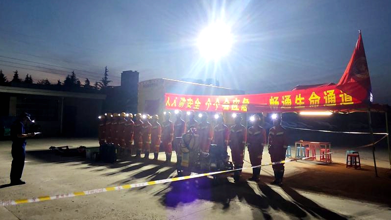 到達(dá)演練現(xiàn)場,指戰(zhàn)員按照救援預(yù)案完成事故現(xiàn)場進(jìn)行探察,昏暗的夜色中快速啟動照明發(fā)電車、敷設(shè)水帶、安裝水泵,恢復(fù)廠區(qū)供電照明,實(shí)施排水作業(yè)。待蓄水池水位下降后,按照“先通風(fēng),再檢測,后作業(yè)”的要求,對遇險(xiǎn)人員進(jìn)行搜救,當(dāng)晚21時(shí)許經(jīng)過一個(gè)小時(shí)的緊張作業(yè),全面完成救援演練任務(wù)。