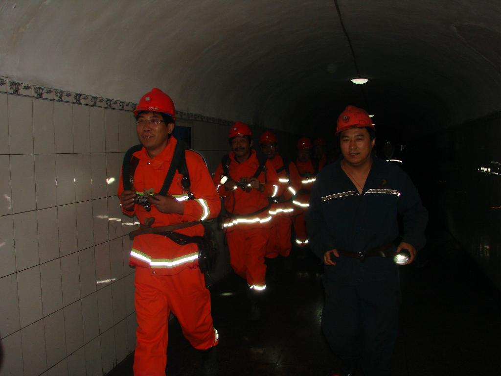 當(dāng)日15時05分,礦調(diào)度室電話猝然急響,“東二擴(kuò)大區(qū)2102進(jìn)順工作面探眼內(nèi)涌水,1小時內(nèi)涌水量迅速擴(kuò)大,12人被困井下……!”險情突現(xiàn),礦井事故應(yīng)急救援預(yù)案立即啟動,總調(diào)度、總指揮、救援指揮部等全部進(jìn)入應(yīng)急狀態(tài),命令掘進(jìn)隊(duì)“迅速撤離工作面,地測科及生產(chǎn)科人員下井進(jìn)行水情調(diào)查!”25分鐘,被困人員按避災(zāi)線路撤離到擴(kuò)大區(qū)變電所口,其間,跟班隊(duì)長報告“1名職工撤離途中腰部傷”。 應(yīng)急指揮部副組長昝六民立即帶領(lǐng)救護(hù)隊(duì)員下井救援。17時20分,受傷礦工成功獲救。整個演習(xí),從接到現(xiàn)場匯報開始,經(jīng)過礦應(yīng)急小組調(diào)度各種資源組織避災(zāi)、自救,到受“涌水事故”威脅的12人全部安全升井,用時2小時40分鐘。其中進(jìn)行了報警、接警演習(xí)、撤人演習(xí)、地面應(yīng)急演習(xí),使職工熟悉了發(fā)生水災(zāi)事故時的撤退線路,增長了避災(zāi)知識,進(jìn)一步了解了應(yīng)急措施啟動后的程序,全面檢驗(yàn)了礦井防治水管理水平和礦井防災(zāi)抗災(zāi)的能力。