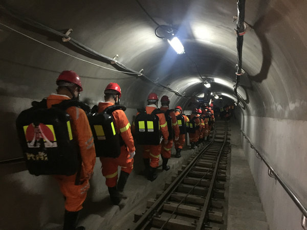 按照應(yīng)急演練預(yù)案設(shè)置,在基地演習(xí)巷道內(nèi)模擬某礦井102綜采工作面發(fā)生火災(zāi)事故,事故原因不詳,現(xiàn)有三人被困井下,請大隊救援。接報后,大隊立即啟動礦山應(yīng)急預(yù)案,迅速集結(jié)應(yīng)急救援指揮部成員前往救援,在聞警集合、下井準備、災(zāi)區(qū)偵察、搶救傷員、恢復(fù)通風(fēng)、搶救遇險人員、搬運遇難人員等一系列救援演練,整個演練用時2個半小時。共使用8種國投裝備,5種特種車輛、參演人員達到了90余人,先后處置了瓦斯超限、冒頂,受傷人員、急救蘇生、通訊系統(tǒng)損害等問題。參演部門和人員密切配合,嚴格按照命令和方案執(zhí)行,較好的檢驗了應(yīng)急裝備及國投應(yīng)急救援裝備操作使用的能力,起到了預(yù)期的目的,也暴露出了應(yīng)急管理及國投救援裝備及性能等方面存在的問題和不足,這是我們以后不斷努力的方向。