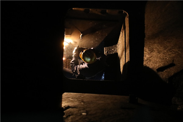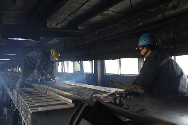 井巷中,傳來陣陣“一二、嘿喲……”的號(hào)子聲,打破了一片寧?kù)o,機(jī)電車間職工抬起管路步伐有力堅(jiān)定。綜采隊(duì)職工迅速就位,按照技術(shù)要求拆卸裝置,一二部膠帶進(jìn)行合并。主斜井機(jī)尾處,運(yùn)轉(zhuǎn)隊(duì)職工為膠帶上夾板硫化9#接頭。南風(fēng)井儲(chǔ)水池內(nèi),職工穿上防水服疏通管路。螺旋篩倉(cāng)里,職工正在使用氧焊修復(fù)襯板。一時(shí)間從井下到地面,檢修的旋律瞬間奏響。