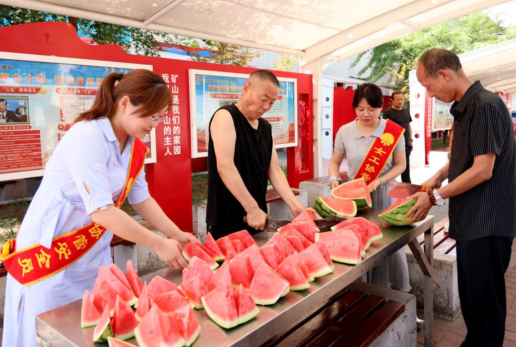 活動現(xiàn)場,該礦工會將精心選購的大西瓜提前切好,當(dāng)上下班職工們陸續(xù)走來,女工協(xié)管員們立刻迎上去,把清甜多汁的西瓜遞到礦工手中:“師傅,您辛苦了!吃塊西瓜解解暑!”同時圍繞夏季防暑、作業(yè)安全,用嘮家常式的話語,提醒職工別因天熱疏忽安全,要做好防護(hù)、規(guī)范操作。礦工們邊啃瓜、邊點頭,紛紛表示為了企業(yè)的安全發(fā)展和家庭的幸福美滿,牢記囑咐,按章作業(yè)。