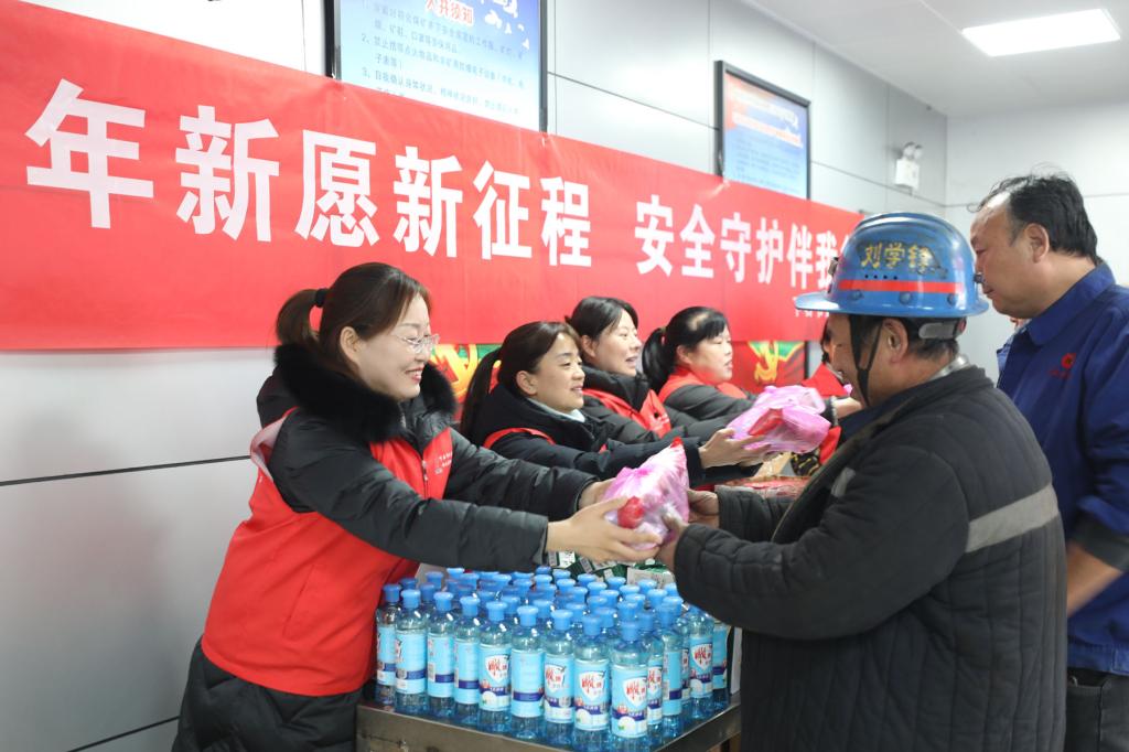 在該礦井口慰問(wèn)活動(dòng)現(xiàn)場(chǎng),牛奶、面包、火腿、洗潔精等慰問(wèn)品整齊擺放,身穿紅色馬甲的女工、安全協(xié)管員與一線職工面對(duì)面,將一份份滿載心意的物品遞到干部職工手中,為即將投入工作當(dāng)中的礦工兄弟們送上新年第一份平安祝愿。