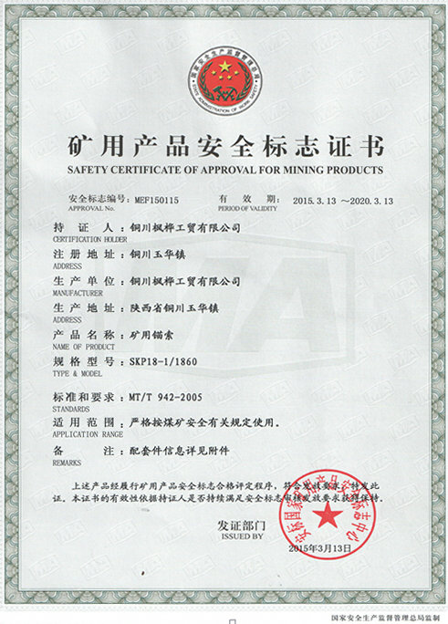 近日,奧博集團楓樺公司自主研發(fā)的SKP18-1/1860礦用錨索順利通過安標國家礦用產(chǎn)品安全標志中心認證,并取得證書。據(jù)悉,這是該企業(yè)取得的第四項礦用產(chǎn)品安標證書。