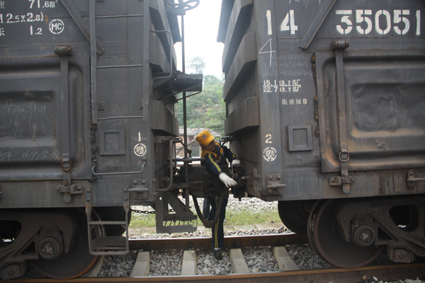 風管是機車車輛的連接部分,起著供氣、制壓、緩解的作用,被譽為機車車輛的“氧吧”和“穴道”。在技術(shù)員李小紅、陳家山車站副站長陳獻軍等人監(jiān)督下,每個調(diào)車員要按照“一關(guān)前、二觀后、三摘風管、四提鉤”的要求,在指定的位置、規(guī)定的時間完成所有動作。