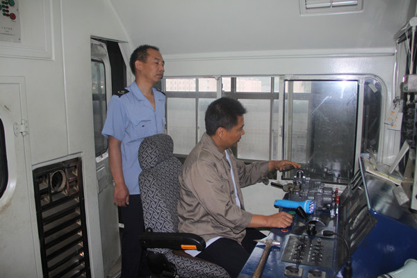 閆華林不管是在電器間、電機間、柴油機間、風泵間、冷卻間等處都小心翼翼地對每個部件進行檢查,只聽見他一會說“設(shè)備狀態(tài)良好”、一會說“ 安全性能穩(wěn)定”,并發(fā)現(xiàn)了一處漏油點。之后,他又來到了內(nèi)燃機車走行部對手扶桿、腳蹬、排斥器、閘瓦等一一進行了檢查,在規(guī)定時間內(nèi)進行完畢。