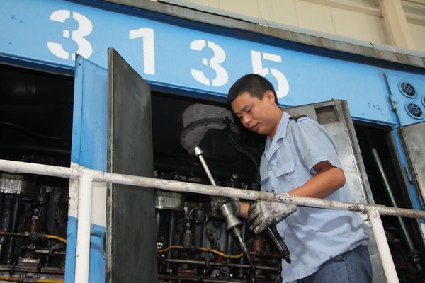 只見副司機(jī)王陽陽手持工具、手燈、筆、紙,開始對內(nèi)燃機(jī)車進(jìn)行檢查。監(jiān)考官郭振對筆者說“這個檢查面非常廣、點(diǎn)也非常多,主要對內(nèi)燃機(jī)車下面行走部的車鉤、閘缸閥、車輪、沙箱、減壓器、緩沖部和內(nèi)燃機(jī)車上面的風(fēng)泵間、采油機(jī)間、電機(jī)間、電器間、司機(jī)室進(jìn)行檢查?!?/p>