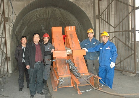 現(xiàn)場(chǎng)指揮領(lǐng)導(dǎo)及工人護(hù)送膠帶設(shè)備入井