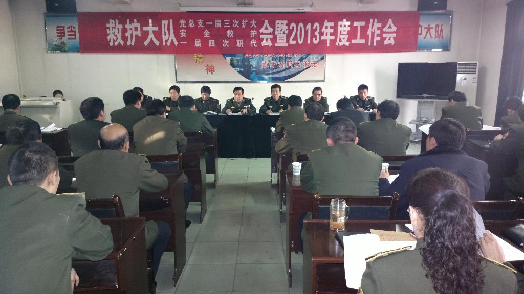 1月25日上午8:30分在莊嚴的國歌聲中,救護大隊黨總支一屆三次擴大會、一屆四次職代會、安全救護會暨2013年度工作會在大隊四樓會議室拉開帷幕。救護大隊黨政領導和各科室、各中隊主要負責同志、職工代表、先進集體和先進個人代表成員等50余人參加了大會。救護大隊大隊長劉平治首先作了題為《強化管理,團結奮進,為全面實現(xiàn)大隊2013年各項目標而努力奮斗》行政工作報告。報告中全面總結了2012年救護大隊在基礎設施建設、安全培訓、安全救護等方面取得的可喜成績,切實地指出了存在的問題和不足。同時,明確了2013年工作目標并提出具體要求。