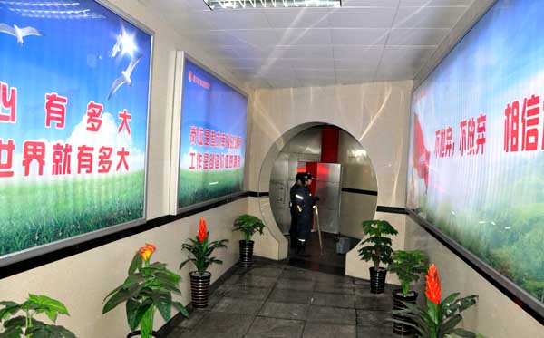 該礦文化長廊分為企業(yè)文化、安全文化兩大陣地,內(nèi)含127塊燈箱、牌板,全長193米,依托生產(chǎn)區(qū)隊(duì)值班樓一樓,鏈接入井通道至入井口,遵循“道亦道,非常道”理念,以粉紅色系為主,體現(xiàn)粉色在企業(yè)文化色中的非常之重;輔以藍(lán)天、白云、綠地、金黃等色系,闡釋企業(yè)文化建設(shè)的平常之外,既闡釋“道法自然”,又演繹“大愛無言”。企業(yè)文化長廊,分為文化擷萃、理念引領(lǐng)兩部分。入口以藍(lán)白色系為主,鏈接以玫紅、粉紅為主,出口以山水畫的墨青墨白色為主,定位“勞動(dòng)光榮、礦工偉大”,遵循集團(tuán)、公司理念引領(lǐng),集結(jié)燈光、圖影與文字,締造“東坡文化”的人文形象,使企業(yè)文化隱于大同小異的燈箱之下,以“激越、浪漫、唯美”的身姿,引領(lǐng)視覺“凝然寂神,思接千載”,看“神馬不是浮云”,上映一臺(tái)“光影秀”。